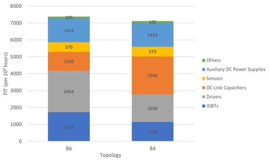 The B4 topology shows a better MTFB, with a total of 140,557 h while the B6 topology achieves 135,410 h. To determine the reason why the B6 topology presents a lower MTBF, Figure 25 disaggregates the FIT for both topologies.