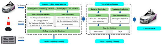 Two types of autonomous vehicle decision-making behavior in the parking lot are considered, namely the decision to select the optimal parking space and the behavioral decision during autonomous vehicle driving. The overall structure is shown in Figure 1. In the optimal parking space decision, the study uses multi-attribute decision to select the optimal parking space [12]. In autonomous vehicle driving behavioral decisions, the study uses a combination of the behavior tree and DQN to make decisions about the behavior of autonomous vehicles and incorporates the predictive trajectory method from other vehicles in some specific scenarios.