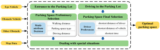 The decision framework for selecting the optimal parking space is shown in Figure 2. The decision method is divided into two main parking scenarios: at the entrance of the parking lot and during the driving in the parking lot.