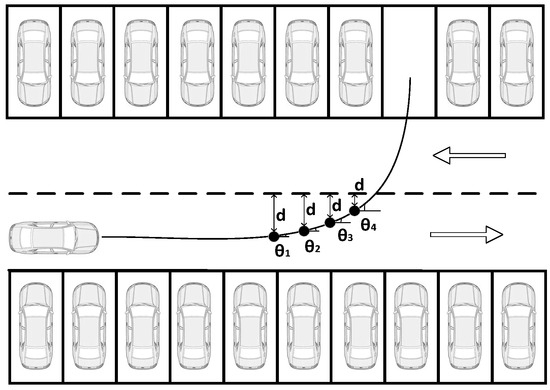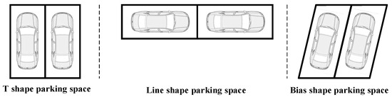 There are three types of parking spaces, namely the T shape parking space, the line shape parking space, and the bias shape parking space, as shown in Figure 3. We use to represent the parking difficulty of three types of parking spaces, with the value relationship [9].