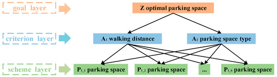 The calculation process of AHP is shown below. Firstly, the hierarchical structure model is established as shown in Figure 4. The goal layer is the optimal parking space, the criterion layer is the walking distance and the type of parking space, and the scheme layer is the alternative parking space.