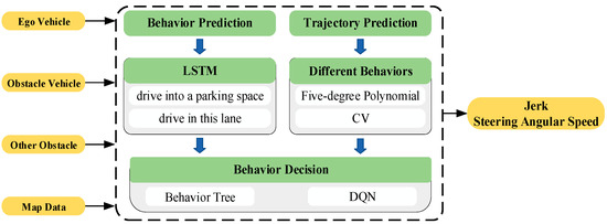 The autonomous vehicle driving decision framework diagram is shown in Figure 5. It includes three main parts. In some specific situations, we can first predict the trajectory of the target vehicle driving in a straight lane. Then, we can use the behavior tree to make a decision on the vehicle’s behavior and output the behavior that the vehicle follows or other behaviors, and finally input the result into the DQN method to output the vehicle’s jerk and steering wheel angular speed.