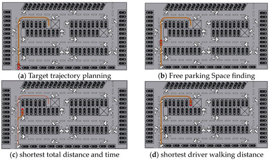 As shown in Figure 14a, when the autonomous vehicle is at the entrance of the parking lot, a trajectory towards the target parking space is planned based on the information from the multi-attribute decision method and the parking lot map. When the autonomous vehicle travels to the location shown in Figure 14b, its sensing system will find a free parking space. The autonomous vehicle will then make a choice based on the driver’s preference in the target parking space and free parking space decision. When the driver’s preference is the shortest total distance by the autonomous vehicle and the shortest time taken by the driver to park, the autonomous vehicle will park in the parking space shown in Figure 14c. When the driver’s preference is the shortest distance walked by the driver, the autonomous vehicle will park in the parking space shown in Figure 14d.