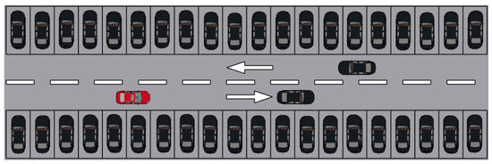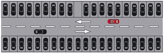 The current parking spaces are used as shown in Figure 13, but the autonomous vehicle has no access to information such as the utilization rate. The red car is the autonomous vehicle. The vehicle travels at about 3 m/s and the pedestrian walks at about 1 m/s.