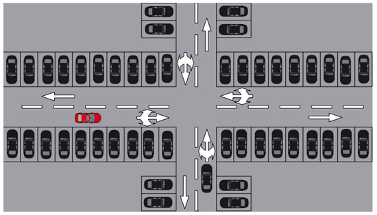 In the parking lot, surrounding obstacles include vehicles, pedestrians, other static obstacles, etc. [23]. The parking lot can be divided into three small scenarios for consideration: straight-line driving scenario, intersection driving scenario, and parking space driving scenario. The behavioral decision results may be different in different driving scenarios. Autonomous vehicles can enter different scenarios according to the access conditions of different scenarios in the behavior tree decision model. The access conditions of the straight-line driving scenario can be set as follows: the road segment that the autonomous vehicle is about to drive is a straight road, the distance between the vehicle position and the intersection center point is greater than 10 m, and the distance between the vehicle position and the target parking space is greater than 10 m. The scenario decision model diagram is shown in Figure 6.