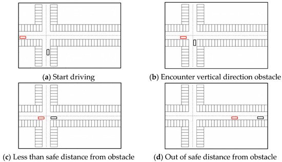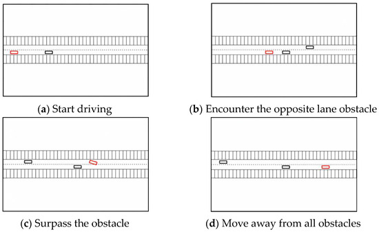 In Figure 18, the red vehicle is the autonomous vehicle, driving in the right direction, and the black vehicle in the same lane as the red vehicle is the obstacle vehicle, driving in the same direction as the autonomous vehicle. The black vehicle in the other lane is an obstacle vehicle, traveling in the opposite direction to the self-driving vehicle. The figure from a to d is the process diagram of the key points of the interaction process.