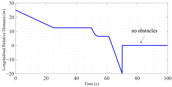 In terms of vehicle behavior decision, according to the behavior tree decision model, the autonomous vehicle enters the following scenarios in turn, the straight-line driving scenario, intersection driving scenario, and straight-line driving scenario, and performs corresponding behaviors according to the surrounding environment. The behavior is shown in Figure 24. Ensuring that the autonomous vehicle slows down during the intersection driving scenario, in terms of the relative distance between the vehicle and the obstacle, if the longitudinal relative distance between the autonomous vehicle and the vehicle obstacle is greater than 0 when performing any behavior, the safety can be ensured as shown in Figure 26.