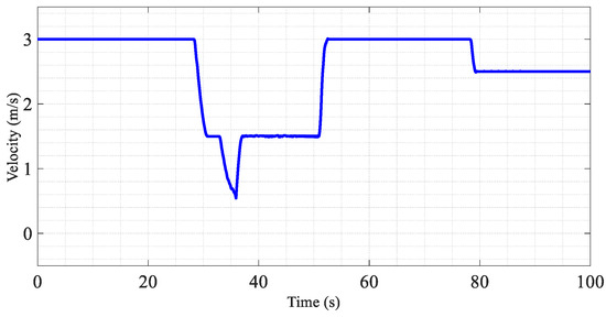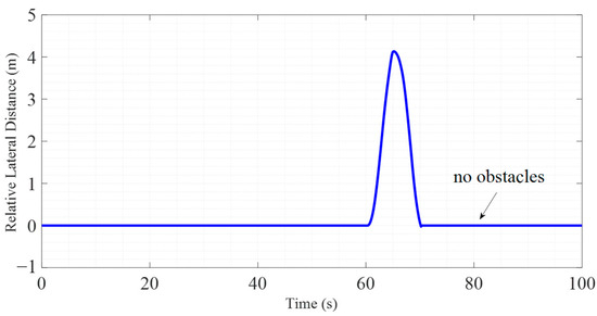 A straight-line driving simulation scenario in the parking lot is established as shown in Figure 15, in which the red vehicle is the autonomous vehicle, and the black vehicles are the obstacle vehicles. The obstacle vehicle in the same lane as the autonomous vehicle drives at a speed of 2.5 m/s and then gradually decreases to 0. The obstacle vehicle in the lane different to the autonomous vehicle first stops and then drives at a speed of 3 m/s, and finally the speed decreases to 0. The effect diagrams are shown in Figure 18, Figure 19, Figure 20, Figure 21 and Figure 22.