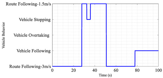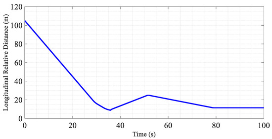 In terms of vehicle behavior decision, according to the behavior tree decision model, the autonomous vehicle enters the straight-line driving scenario, and performs corresponding behaviors according to the surrounding environment. The behavior is shown in Figure 19, including the output result of the decision tree model decisions such as vehicle stopping in the interaction process. Figure 20 shows the speed information decided by the autonomous vehicle through the DQN in this interaction process. When the vehicle ahead stops with no obstacles in the opposite lane, the autonomous vehicle performs a vehicle overtaking behavior, which helps to improve vehicle driving efficiency. The safety of the autonomous vehicle is ensured by the fact that at least one of the horizontal and vertical relative distances from the vehicle obstacles is greater than 0 when performing any behavior, as shown in Figure 21 and Figure 22. Figure 21 shows the relative longitudinal distance between the autonomous vehicle and the vehicle in front of it. Figure 22 shows the relative lateral distance between the autonomous vehicle and the vehicle in front of it.