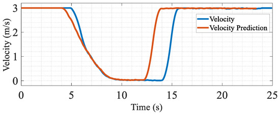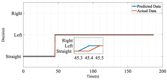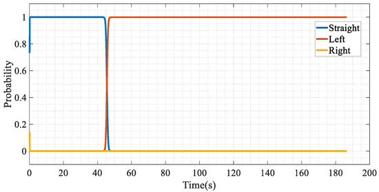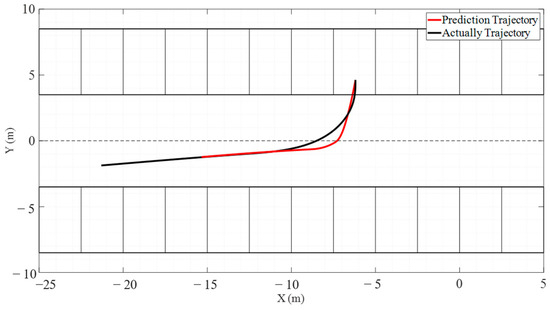 A straight-line driving simulation scenario is built as shown in Figure 17, in which the behavior of the target vehicle is predicted by using the LSTM method, and the prediction results are shown in Figure 27 and Figure 28. Between 0 and about 45 s, the probability of a vehicle performing the behavior of continuing to drive along this lane is close to 1; between 45 s and 52 s, the probabilities of the three behaviors change, with the probability of a vehicle performing the behavior of continuing to drive along this lane decreasing and the probability of a vehicle performing the behavior of driving out of this lane into the left parking space increasing and eventually approaching 1; after 52 s, the probability of a vehicle’s behavior does not change, as shown in Figure 27. The vehicle’s behavior prediction results also overlap with its real behavior, and the behavior prediction results predict that the vehicle is about to perform the act of driving out of this lane into the left parking space about 0.1 s earlier than the real results as shown in Figure 28. The predicted and actual trajectories are shown in Figure 29. The error values of the two trajectories are shown in Figure 30. The maximum error value occurs when the target vehicle is driving out of this lane.