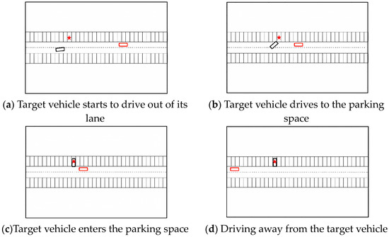 where represents the distance from the passing free parking space to the pedestrian exit, represents the distance from the target parking space to the pedestrian exit, and represents the occupied probability of the target parking space, which can be calculated as: