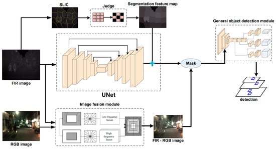 In this study, we introduce a deep neural detection network named Prior-AttentionNet, which is based on a Prior-Attention module and image fusion for pedestrian detection under varying illumination conditions. The architecture of Prior-AttentionNet is depicted in Figure 1 and primarily consists of two parts: the image fusion algorithm framework and the detector framework. Within the image fusion algorithm, this paper focuses on adopting superpixel segmentation to extract prior features from infrared images. These features are then integrated into the UNet [37] saliency attention extraction module to obtain feature maps, which are combined with the FIR-RGB fused image.