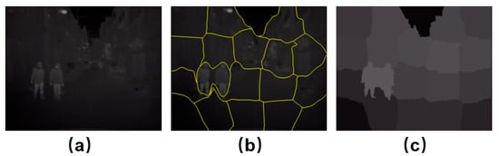Through the segmentation, the image can be split into pieces of superpixels. Each superpixel comprises pixels with similar thermal features, and the gray-scale value of each superpixel corresponds to the level of thermal radiation. The superpixels with a gray level higher than the setting threshold are the attention area, which retains the objects. We expect that a small- or middle-scale object can be entirely involved in one single superpixel block. In some cases, small objects may be divided into multiple disconnected superpixels. To solve this issue, we use an iterative process to update the cluster centers until the error converges. This enhances the connectivity among superpixels. In Figure 2a,b, we can see that an FIR image decomposes to superpixels. Two pedestrians are included in one superpixel.