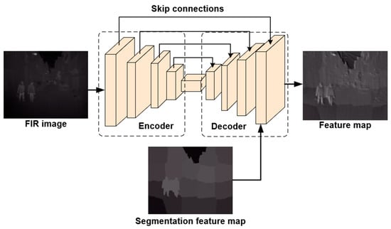 Segmentation enhances the superpixels of the foreground area prior to filtering while weakening the superpixels of the background area. In Figure 2, SLIC segments the FIR image into a set of superpixels, forming a segmented image, which is ultimately transformed into a segmentation feature image based on the average gray-scale values of the superpixels.