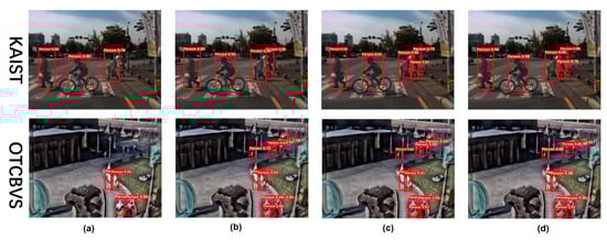 Detection on KAIST and OTCBVS with YOLOv5: (a) FIR-RGB mode; (b) FIR-RGB + Saliency Attention mode; (c) FIR-RGB + Segmentation mode; (d) FIR-RGB + Prior-Attention mode.