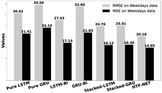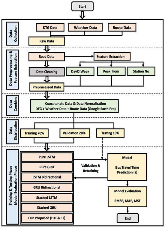 The data collected from the DTG device underwent several preprocessing steps, including data scrubbing, matching weather data, data standardization, and partitioning the data into specific study areas for analysis. These preprocessing techniques ensure that the data are in a suitable format for further investigation. To optimize the performance of the deep learning models, hyperparameter tuning was conducted using the preprocessed data. This involved selecting the appropriate batch size, determining optimal factors, tuning the number of hidden layers, and selecting the number of epochs. By fine-tuning these hyperparameters, we aimed to achieve the best possible performance from the models. Once the hyperparameters were optimized, a comprehensive comparison was performed among different deep learning models. These models included pure LSTM, pure GRU, LSTM bidirectional, GRU bidirectional, Stacked-LSTM, Stacked-GRU, and our proposed model HTF-NET. By evaluating and contrasting the performance of these models, we sought to identify the most effective approach for bus travel time prediction. The flow chart of the study is shown in Figure 3.