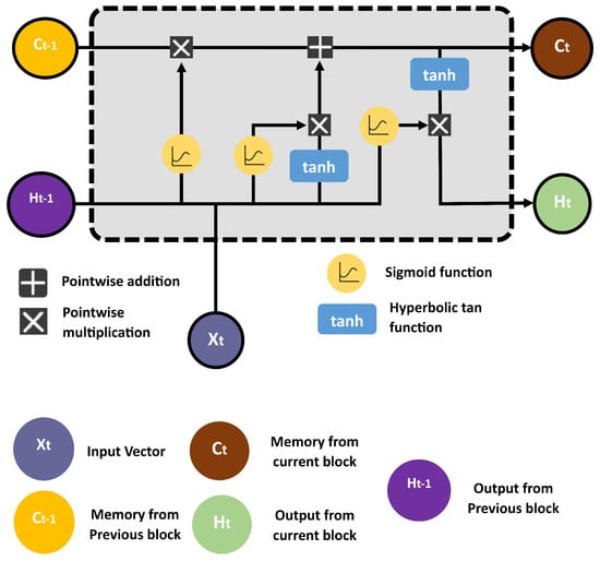 Hochreiter and Schmidhuber [] introduced the LSTM model as an effective tool for learning long-term dependencies. This model has demonstrated remarkable success across diverse domains, including finance, healthcare, and transportation. Its applications range from predicting stock prices and diagnosing diseases to forecasting traffic flow [,]. Notably, LSTM has gained significant traction among researchers for predicting bus travel times [,,]. LSTM excels at capturing segment-level and long-term information in traffic data due to its intricate structure, as illustrated in Figure 4. This complexity arises from its gating mechanism, encompassing the forget, input, and output gates. These gates, defined by Equations (1)–(3), empower LSTM to address long-term dependencies by extending the memory cycle of the network.