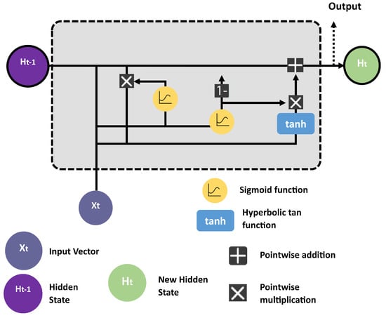 The GRU (Gated Recurrent Unit), another refined variant of recurrent neural networks (RNNs), offers a more streamlined architectural approach compared to LSTM by employing just two gates: the update gate and the reset gate, as opposed to LSTM’s three. This simplification enhances the GRU’s overall efficiency and reduces the number of trainable parameters, as noted in []. In this experiment, we utilized a two-layer GRU model. The structural representation of the GRU cell can be observed in Figure 5, and the mathematical expressions governing the functioning of these two gates to regulate information flow within the cell are detailed in Equations (4)–(7). The equations describing the GRU model are sourced from [].