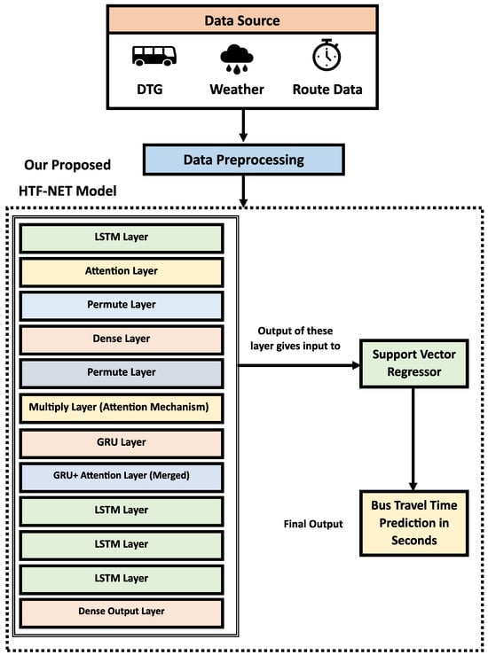 The Hybrid Temporal Forecasting Network (HTF-NET) represents an advanced neural network architecture engineered for precise temporal forecasting, with a specific focus on predicting bus travel times. This model leverages an integration of LSTM and GRU layers, augmented by an attention mechanism. Notably, the model’s predictive capabilities are further refined through integration with an SVR for travel time predictions.