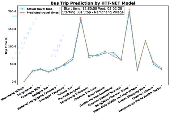 In this study, we presented an approach to predicting bus travel time using digital tachograph (DTG) data. Our methodology has the potential to enhance scheduling accuracy and improve passenger’s travel experience by providing real-world travel time information. The evaluation involved seven deep learning models tested on a sub-route from Namchang Village bus stop to Dongnam-gu Public Health Center. This route, covering a diverse landscape of universities, hospitals, shopping malls, and public areas over an 8.5 km road length, offered a representative scenario for assessing the models’ performance under various traffic conditions. Five experiments were conducted, analyzing the models’ performance across different scenarios, including overall test data, weekdays, weekends, with and without weather information, and different route types (long and short). Notably, our proposed Hybrid Temporal Forecasting Network (HTF-NET) model consistently exhibited exceptional performance, with the lowest root mean squared error (RMSE) and mean absolute error (MAE) values. This underscores its strong capacity to predict travel times accurately under diverse traffic patterns on both weekdays and weekends. Our study also highlighted the importance of weather data in travel time prediction. The exclusion of weather information led to a significant drop in prediction accuracy, emphasizing the necessity of integrating weather data into travel time prediction models. Specifically, the HTF-NET model outperformed the baseline ARIMA model by 63.27% in terms of the RMSE, indicating the practicality of this model for real-world applications. However, it is essential to note the limitations of our study. The models were trained on data collected under normal traffic conditions, excluding unexpected events such as accidents or work zone activities. This points to a need for future work to incorporate real-time event data, enhancing the model’s robustness and applicability in addressing unforeseen travel disruptions.