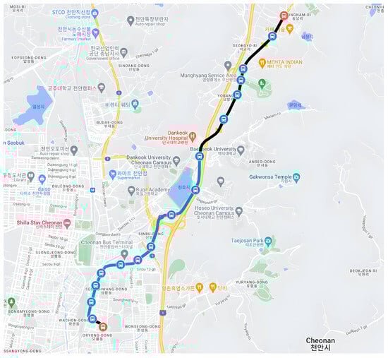 In this study, our focus was on collecting travel time data specifically from public transport buses operating in Cheonan, a significant transportation hub in the central region of South Korea, located approximately 83 km south of Seoul, the capital city. With a population of 689,881 residents as of the end of May 2023. Cheonan is a bustling industrial city, housing renowned companies such as Samsung SDI and Samsung Display. Buses play a pivotal role in the transportation system of Cheonan, with the bus transport authority assigning specific routes to individual buses. Currently, there are over 150 designated routes available for passengers to travel from their source locations to their desired destinations. For our research, we focused on a specific sub-route of route number 200, which spans from the Ibjang bus stop to the Cheonan Station, as shown in Figure 1.