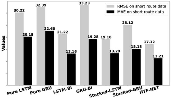 - Root mean squared error (RMSE): RMSE quantifies the average distance between the predicted and actual travel times, measuring the overall prediction error. RMSE is a widely used metric and emphasizes larger errors. It is calculated using Equation (8):