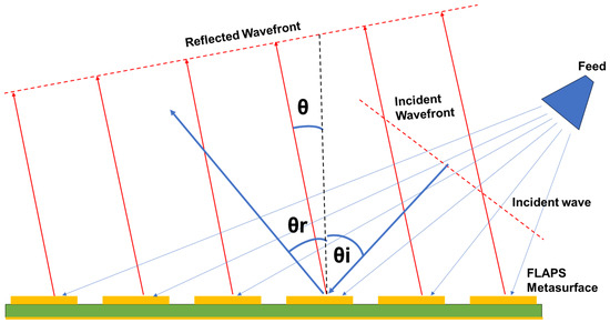 Configuration of the off-axis FLAPS metasurface integrated with a horn antenna feed. The steering of the incident wavefront is achieved by applying a progressive phase shift across the unit cells of the FLAPS metasurface.