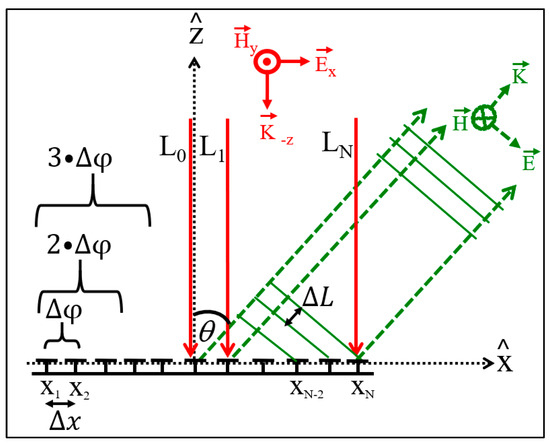 where ΔX is the array periodicity of the MS. For beam steering, ΔL remains constant for all different paths from adjacent cells Xj and Xj+1 throughout the MS. The conversion of ΔL into phase difference is depicted in Equation (2):