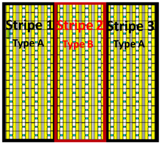 Achieving optimal performance of the MS reflect array antenna necessitates a 360° phase dynamic range. Additionally, the reflected magnitude across the entire phase dynamic range should remain uniform with minimal losses. However, no tuning elements or unit cell geometries can inherently provide the entire phase range with uniform, lossless magnitude. Consequently, once the phase distribution on the MS reflect array surface is determined, the optimization process for each element and unit cell of the MS is utilized to attain the required phase value with minimal losses. Furthermore, most reflect array unit cells and tuning elements are sensitive to the angle of incidence of the wavefront relative to the MS normal. This sensitivity can degrade the performance of the MS reflect array antenna. Therefore, a proper design process should account for the varying angles of incidence beams. One method to enhance the performance of reconfigurable MS reflect array antennas is the stripes method [31]. Based on this method, a Ku band MS reconfigurable reflect array antenna was designed with two types of tunable unit cells, type A and type B, arranged in three stripes on the reflect array surface, as depicted in Figure 3. The tuning element employed in this design was the varactor diode.