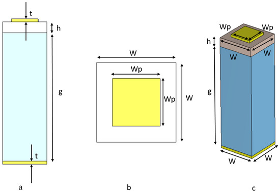 Unit cell design: (a) side view, (b) top view, (c) 3D view.