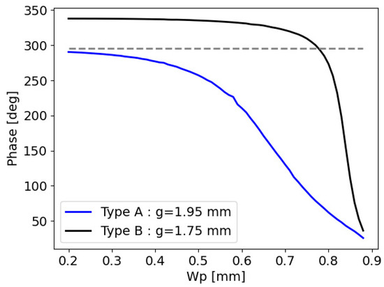 The unit cell size was selected to be W = 0.9 mm, slightly smaller than a quarter of the wavelength at a frequency of 80 GHz, thus qualifying it as a metasurface unit cell [1,2,3,4,5]. This unit cell comprises a ground surface with a copper thickness of t = 0.035 mm, an adjustable air gap, g, and a variable patch width, Wp, printed on a dielectric substrate with a thickness of h. To augment the phase dynamic range of the MS reflect array antenna, a methodology akin to the stripe method was employed [31]. Two distinct unit cell types were developed: type A with g = 1.95 mm and type B with g = 1.75 mm.