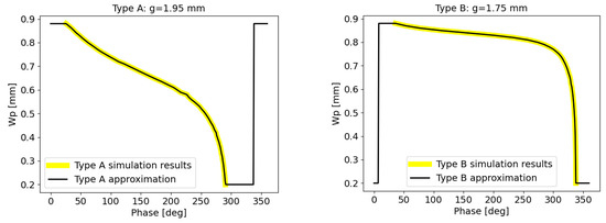 Unit cell reflected phase simulation conducted using the Floquet method. The yellow graphs represent the phase reflection as a function of the patch width, Wp, for unit cell type A (left graph) and unit cell type B (right graph). The black curves, generated by an approximation algorithm, provide additional insight into the relationship between phase reflection and patch width.