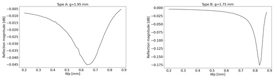 The simulation of the reflected magnitude of the unit cell using the Floquet method is depicted in Figure 7. The left graph corresponds to type A unit cells, while the right graph corresponds to type B unit cells. This simulation considers both the dielectric losses and the losses attributed to the final conductivity of the copper.