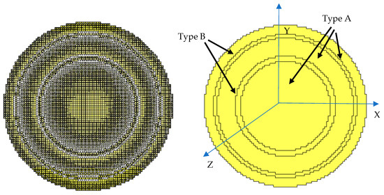 On the (right) side is the metal ground surface which includes contours of type A and type B, and on the (left) side is the substrate with different patch sizes according to the calculation of Equation (4).