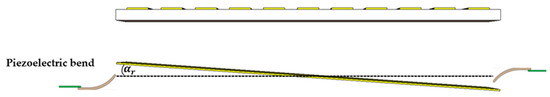 Piezoelectric benders, such as the Thorlabs PB4NB2W with a ±450 μm displacement capacity, can be utilized to rotate the metallic ground surface around its center, as demonstrated in the side view of the constructed MS reflector depicted in Figure 9. This rotation alters the gap distance between the metallic ground surface shown in Figure 8 (right) and the substrate with the copper patches depicted in Figure 8 (left). The gradual modification in the gap distance, denoted as g, for both type A and type B unit cells along the horizontal axis, induces a corresponding gradual change in the reflected phase of these unit cells, thereby influencing the deflection of the reflected beam.