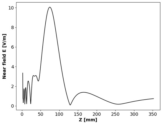 The outcome of the metasurface algorithm was simulated using CST to examine its focal point position along the Z-axis (see Figure 8). In the CST simulation, a plane wave illuminated the reflector, and Figure 10 displays the reflected electric field intensity as a function of distance on the Z-axis from this reflector. The maximum intensity of the reflected electric field was observed at approximately 75 mm from the center of the metasurface reflector, closely matching the designed value of 80 mm.