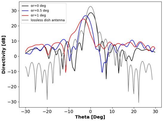 Simulation results of the constructed MS reflector directivity for three rotation angles: the first with (black line), the second with (blue line), and the third with (red line). The reflected beam steering for = ±0.5° is approximately ±2.25°, and for = ±1, it is about ±3°. Additionally, a graph depicting an ideal parabolic antenna is included for reference.