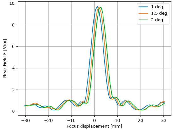 The simulation results of the displacement of the focal point from its origin (at the incident angle of 0 degrees) caused by the incident plane wave angle. The analysis encompasses incident angles of 1, 1.5, and 2 degrees.