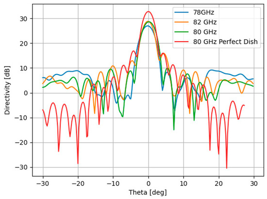 The directivity of the constructed MS reflector was simulated using a horn antenna positioned at the metasurface focal point. The simulation results are illustrated in Figure 11 for the cases of , and (see Figure 9).
