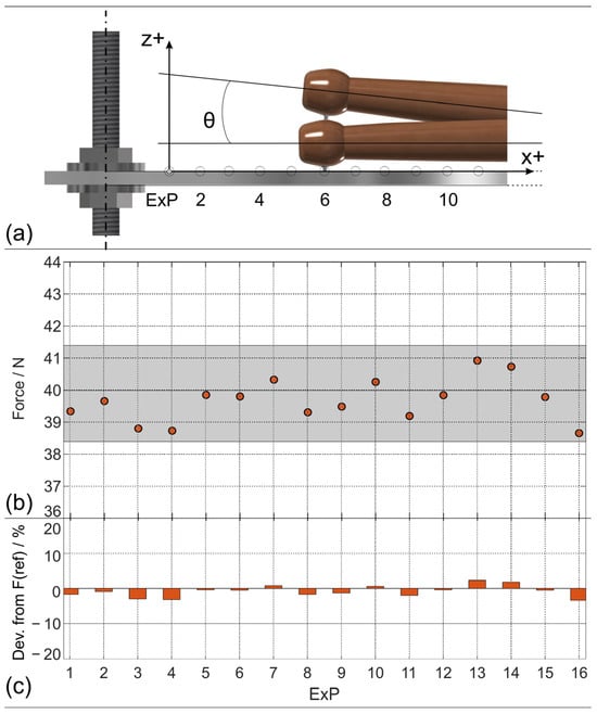 (a) The modified drumstick with the hammer tip for θ = 0° and 3° at ExP-6 and the axis origin set on ExP-1, (b) mean force for the eight repeated sets of measurements on the 16 ExPs along R1 and (c) deviation % from the reference force F = 40 N.