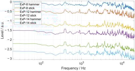 Spectra of the emitted sound excited by the modified drumstick with impact force F = 40 N at the representative points ExP-6, -12, and -14 by the hammer vs. the wooden tip (level in a.u.).