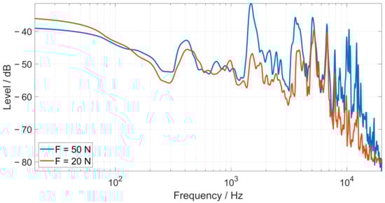 The recorded sound time series and spectra, including the meta-data details of spatial coordinates of the excitation point and the impact force value, are collected and seeded to the sound DB. Additionally, the frequency response function using a kinematic quantity can also be determined and further used in FEM models for vibroacoustic analysis [10,11,12,13]. Extra development and the enrichment of the DB can be achieved by varying the applied force via the alterations of the current intensity that drives the EP of CCR. In this context, two measurement sets are additionally performed with a mean force value of 20 N and 50 N. The differences in the sound spectrum after exciting the Al sheet at the same point with the hammer by applying different forces are shown in Figure 5. The increase in the input energy to the sheet is evident in the spectrum by the level increase. It must be noted that the frequency spectra characteristics for both forces, even if their values differ by 30 N, preserve the same behavior, as expected.
