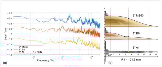 The 8-inch Al reference sheet is replaced by the 8-inch bell-shaped MS63 alloy splash cymbal, supported at height H1 by bolts fastened again with the same torque measured by the gauge. The G-code is modified and adjusted at the new Z-coordinates for each of the sixteen ExPs, according to the CAD axisymmetric cymbal profile. The accelerometer and the microphone are kept at the same positions during the initialization measurements. The sound delay is measured again to determine the time interval between consecutive measurements. The same methodology is also applied to the measurements of a splash medium-thin 8-inch B8 cymbal. The acoustic measurement sequence for sixteen ExPs and for the impact forces of 20, 30, 40, and 50 N are performed. The sound data and the measurements results are recorded and stored, including the corresponding meta-data and are added to the DB under development. Figure 6a shows the microphone recorded sound spectra of the MS63 and the B8 cymbals, after excitation at the ExP-7 within the bow area by an impact force of 30 N by the wooden tip of drumstick, with reference to the 8-inch Al sheet. It must be noted that the ExPs of interest regarding cymbals are in the bow area ranging from ExP-5 to ExP-14, and these ExPs belong to the range where the minimum force deviation values was measured and presented in Figure 2. The representative spectral information in Figure 6a on a given frame, disregarding spectral evolution over time, demonstrates that the detailed spectral characteristics may provide the indications about the geometry and the material of the cymbals required for regression and recognition. Figure 6b presents the distribution of the ExPs for each 8-inch percussion instrument under study. The CAD axisymmetric profile used for the G-codes developed is highlighted and the characteristic changes in the curvature are also obvious and will be used in the future as classes for the ML models.