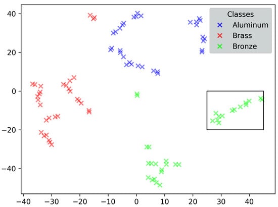 2D layout derived from t-SNE on the 768-dimensional representation for 96 recordings. The 32 recordings for each geometry material are displayed in different color and are almost linearly separable. The area delineated by the rectangle is further analyzed in Figure 8.