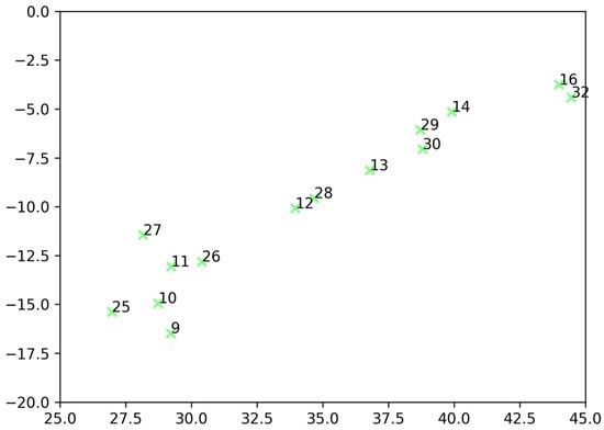 Figure 7 shows the resulting mapping for all 96 recordings, where the colors of each point represent the material/geometry of each cymbal. The results are clearly separable, almost linearly, a fact that indicates that speech-pretrained model performs well on the basic categorization of the examined data. Figure 8 includes a zoomed-in region of Figure 7; this region includes numbers for each point that indicate the corresponding ExP. Namely, numbers 1–16 indicate the 16 ExPs with increasing radius and numbers 17–32 indicate the repetitions, where the repetition of excitation “i” is depicted as “i + 16”. In Figure 8 the repetitions appear close to each other (9–25, 10–26, etc.). This fact indicates that the collected data is consistent, verifying that repeated attempts lead to neighboring results. Furthermore, the placement of consecutive ExPs on consecutive positions on the graph shows that it is possible to do ML-based regression for estimating the ExP of a given sound on a given geometry/material. Similar results can be obtained for other parts of the graph presented in Figure 7.