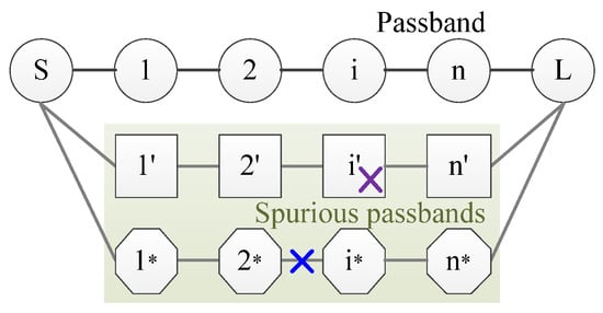 For most waveguide filter designs [,,,,,,,,,,,,,], the fundamental TE101 mode is generally considered to construct the filter passband. Each resonator cavity can support multiple harmonic resonances due to high-order modes; however, it will lead to introducing undesired passbands [,]. The equivalent circuit diagram is shown in Figure 1, where it considers the dominant passband and spurious passbands. Usually, the high-order resonant modes such as TE102, TE201 or TE103 are regarded for coupling to the spurious passbands. Therefore, the idea for breaking spurious passbands to improve stopband performance is mainly focusing on the control of the harmonic modes or the coupled mechanism. As shown in Figure 1, the first way is staggering the intrinsic high-order harmonics, which are marked as the purple symbol “×”.