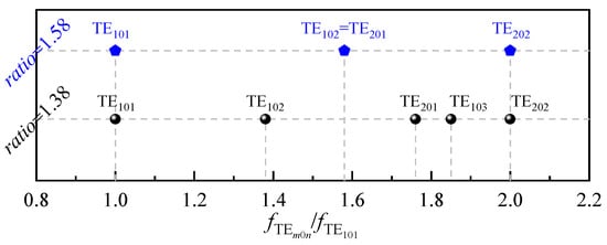 where a and l are the width and length of the cavity along the x-axis and y-axis, respectively. Following (1), the first harmonic passband is usually generated by the TE102 or TE201 mode. Constructions with different ratios of a to l can be controlled to obtain staggered high-order harmonics, i.e., different . Accordingly, Figure 2 gives the normalized frequency distributions of several high-order modes (TEm0n) and the fundamental mode f0 (TE101) in two different cavities. The constitutive resonators are selected at the points of ratio = 1.38 and ratio = 1.58, where is defined as the frequency ratio of the second resonance mode to the fundamental one. It can be seen that the harmonic resonances between and are irregularly distributed on the frequency spectrum for these two types of resonators. The equation is always correct for all resonators in the filter design.