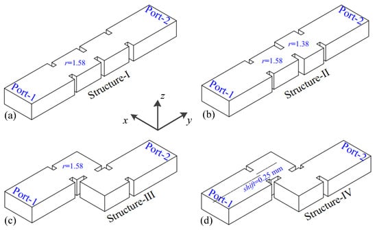 (a) Structure-I: BPF using two identical coupled square resonator cavities; (b) Structure-II: BPF using two different coupled resonator cavities with ratio = 1.38 and ratio = 1.58, respectively; (c) Structure-III: BPF using two coupled square resonator cavities with orthogonal coupling ports; (d) Structure-IV: BPF using two coupled square resonator cavities with orthogonal coupling ports and offset.