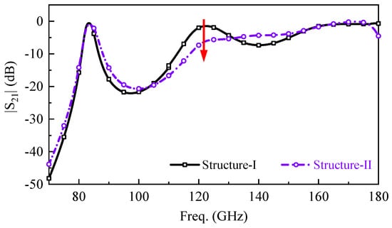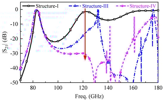 There is a more practical approach for fully suppressing spurious passbands based on the orthogonal architecture design []. The asymmetry between TE102 and TE201 modes after coupling addition can be compensated by moving orthogonal ports away from the middle position with a slight shift, as shown in Figure 3d. From the response comparison of Structure-I, -III and -IV in Figure 6, it is evidently clear that the first spurious passband around 120 GHz can be significantly suppressed to exhibit much better stopband performance. It is worth noting that some other harmonics at higher than 1.5f0 frequencies still exist.