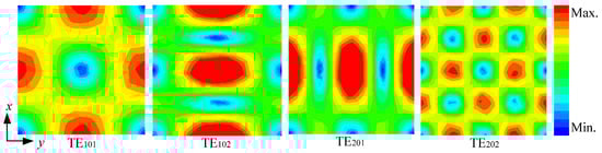 Simulated magnetic-field magnitude distributions of the first four modes including TE101, TE102, TE201 and TE202 in a square resonator cavity.